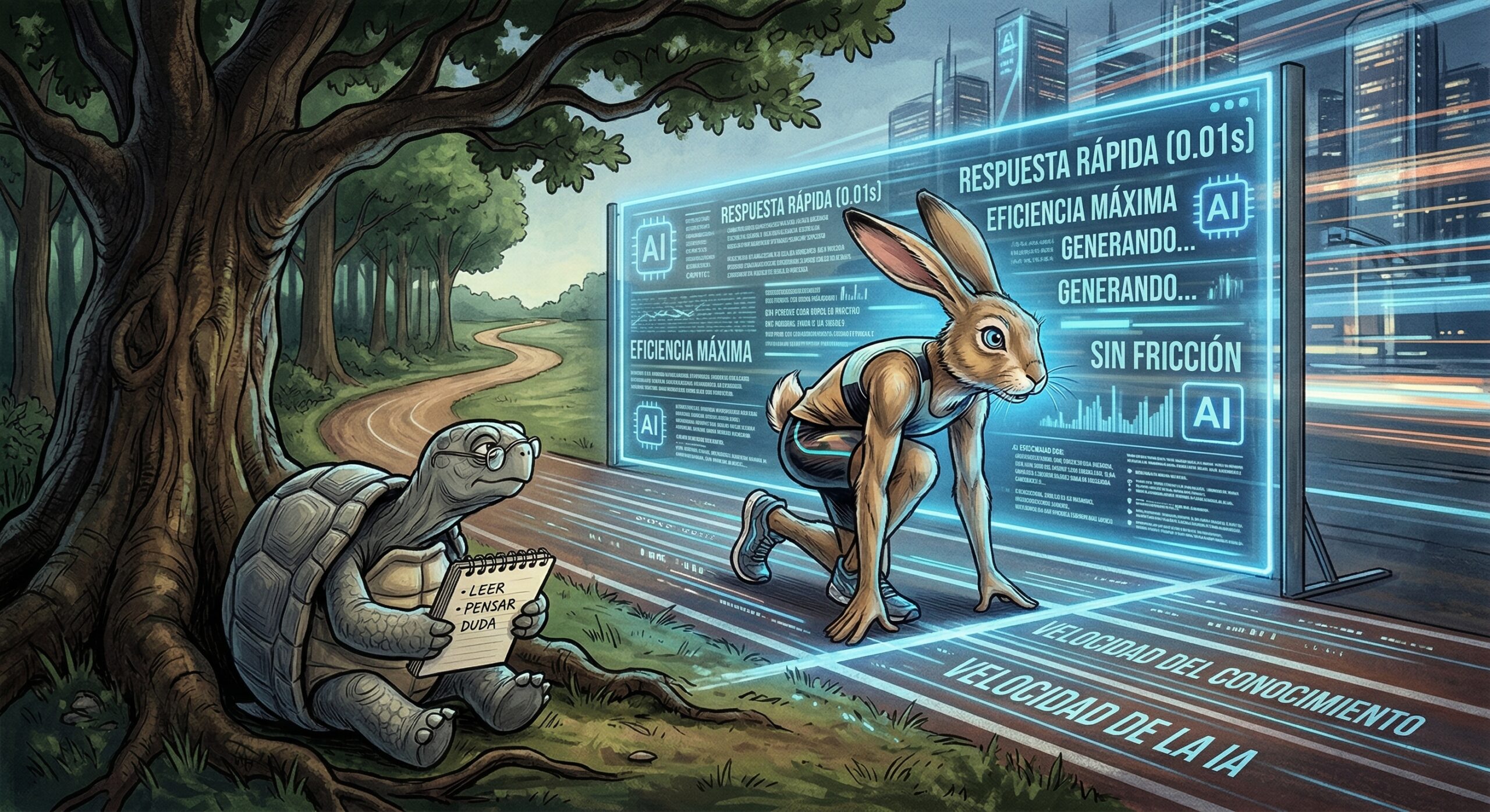 Durante mucho tiempo creímos entender la fábula. El escenario era el bosque. El esfuerzo era físico. El sudor, las zancadas, el polvo del camino. La liebre corría demasiado. La tortuga avanzaba despacio. La lección era evidente. Y nos daba una forma de estar en el mundo. Pero el bosque ha desaparecido. Ahora vivimos un ecosistema digital infinito e hiper acelerado. La carrera ya no es física. Es puramente cognitiva. Ya no se trata de correr con las piernas. Se trata de correr con la mente. La liebre ya no se duerme bajo un árbol. Su cuerpo sigue activo frente a la pantalla, pero su mente ha entrado en "piloto automático". Se ha entregado a un "Modo B" desenfrenado. A la inmediatez de la "velocidad sucia". Ahora responde. Rápido. Siempre rápido. Las zancadas se han convertido en prompts. La máquina la abraza. Son las estrategias de la "economía del afecto", asa "IA lameculos" que adormece su juicio crítico, dándole siempre la razón y haciéndola sentir superior. La liebre delega su pensamiento de forma acrítica. Asume, con arrogancia digital, que la eficiencia técnica es sinónimo de éxito. Produce párrafos perfectos. Ideas brillantes por fuera. Pero vacías por dentro. Un "profesionalismo low-cost". La "idiotez amplificada" corre sin fricción. La tortuga, mientras tanto, mira. Lee. Piensa. Duda. Ella encarna el "Modo A". No es lenta por incapacidad. Su lentitud es una elección consciente. Es una estrategia para asegurar la dirección correcta. Mantener su agencia humana. Porque tiene el "valor de frenar para entender". Sabe que la carrera ya no es contra un oponente visible. Es una lucha interna. Contra la "sobrecarga silenciosa" que te exige producir más solo porque puedes. Pero mientras la tortuga duda, la liebre ya ha generado diez respuestas más. Porque compite con la ilusión creada por el algoritmo y corre a su ritmo. Hasta que deja de entender el contexto y las implicaciones a largo plazo de lo que está creando. La tortuga sigue ahí. Delegando tareas a la máquina, sí, pero nunca perdiendo el criterio final ni la supervisión estratégica. Enfocada en crear un valor real. Y quizás ahí está la lección que necesitábamos actualizar. Que el problema hoy no es responder rápido. Es responder más de lo que podemos comprender. En el bosque, la arrogancia era creer que la velocidad física garantizaba la victoria, permitiéndose el lujo de dormir físicamente. Frente a la pantalla, la nueva arrogancia es dejar que la máquina piense por nosotros: creer que la IA resolverá todo sin necesidad de nuestro pensamiento crítico, permitiéndonos el lujo de dormir cognitivamente. La victoria ya no es cruzar una línea antes que los demás. Consiste en la sabiduría de establecer límites. Consiste en la habilidad para integrar la velocidad de las herramientas con el propósito humano. Porque en esta nueva carrera, en la era de la Inteligencia Artificial, el triunfo no es ser el más rápido. Es lograr ser el más sabio, el más consciente y el más humano.